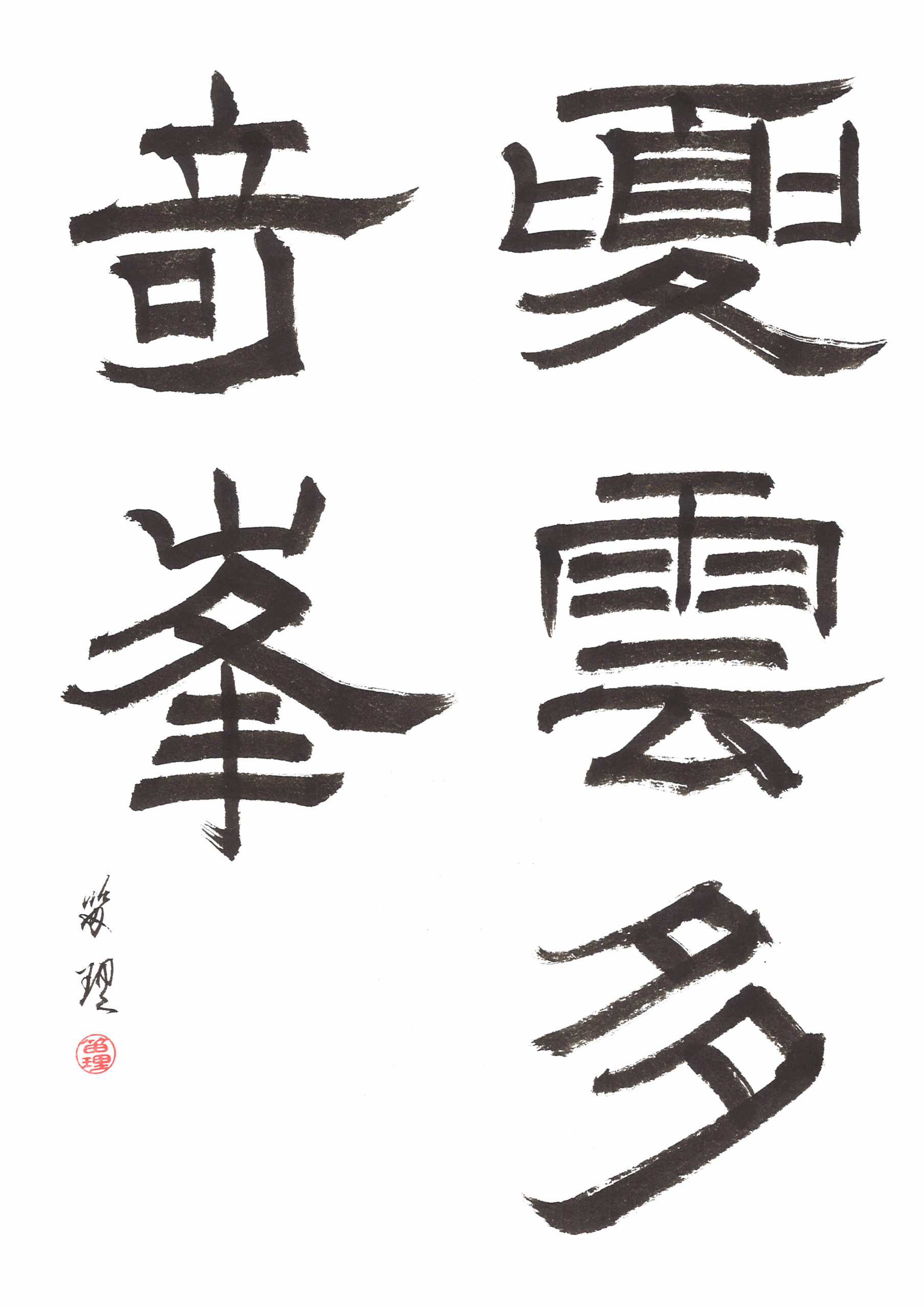 A reisho már egy átmeneti stílus, amely a korábbi (lent), zártabb formákat oldja, és közelebb hozza az írást a mindennapi használathoz. A karakterek szélesebbek, laposabbak, a vízszintes vonalak hangsúlyosabbá válnak, és megjelennek a jellegzetes, finoman kiszélesedő vonalvégek. Ezek a részletek adják a reisho különleges ritmusát: egyszerre stabil és mégis enyhén mozgásban lévő. Bár jól olvasható, már nem olyan merev, mint az őt megelőző pecsétírás formái (lent).